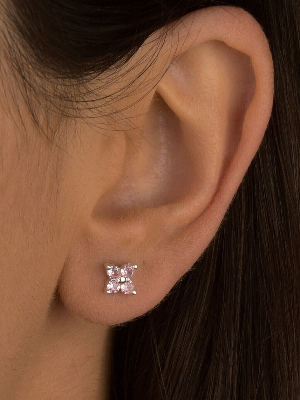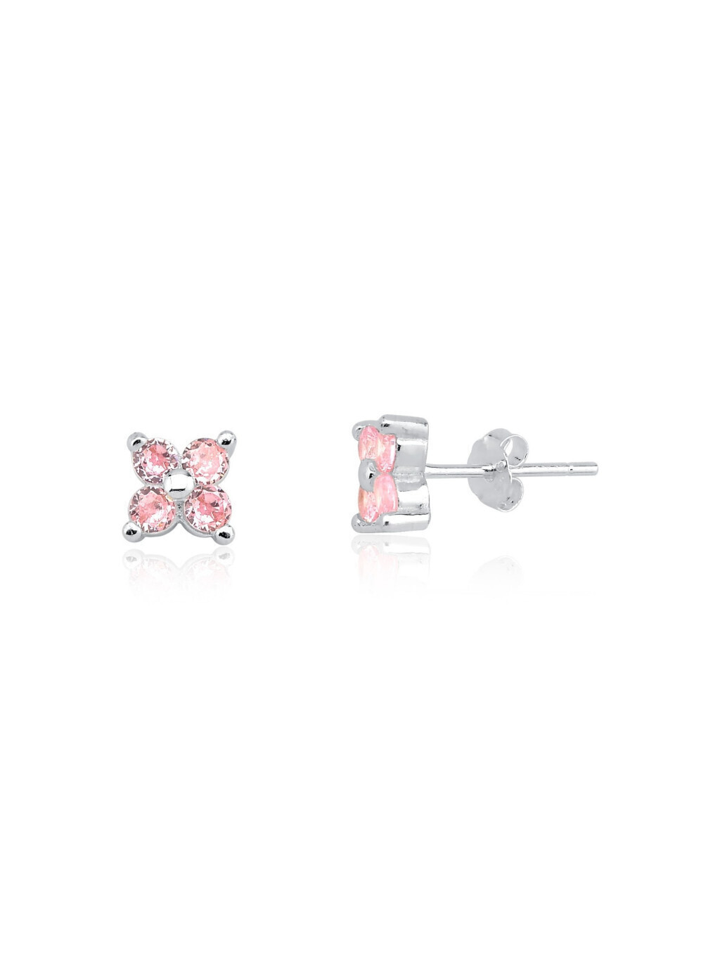 Brinco feminino pequeno 6mm flor em prata 925 legítima cravejado com zircônias na cor rosa claro.