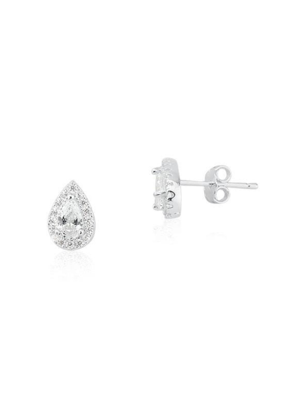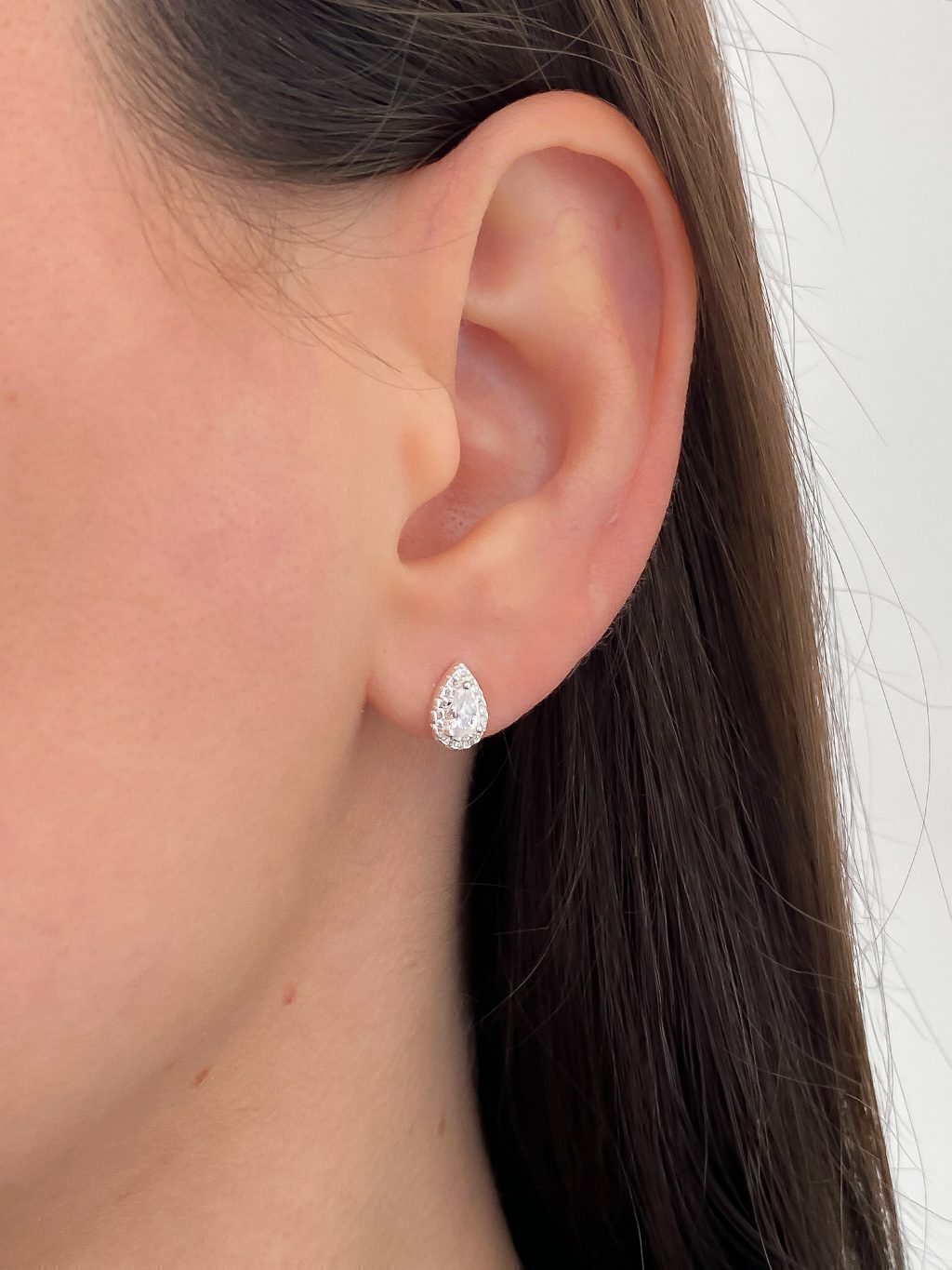 Brinco feminino pequeno em prata 925 legítima zircônia gota cravejada com zircônias ao redor.