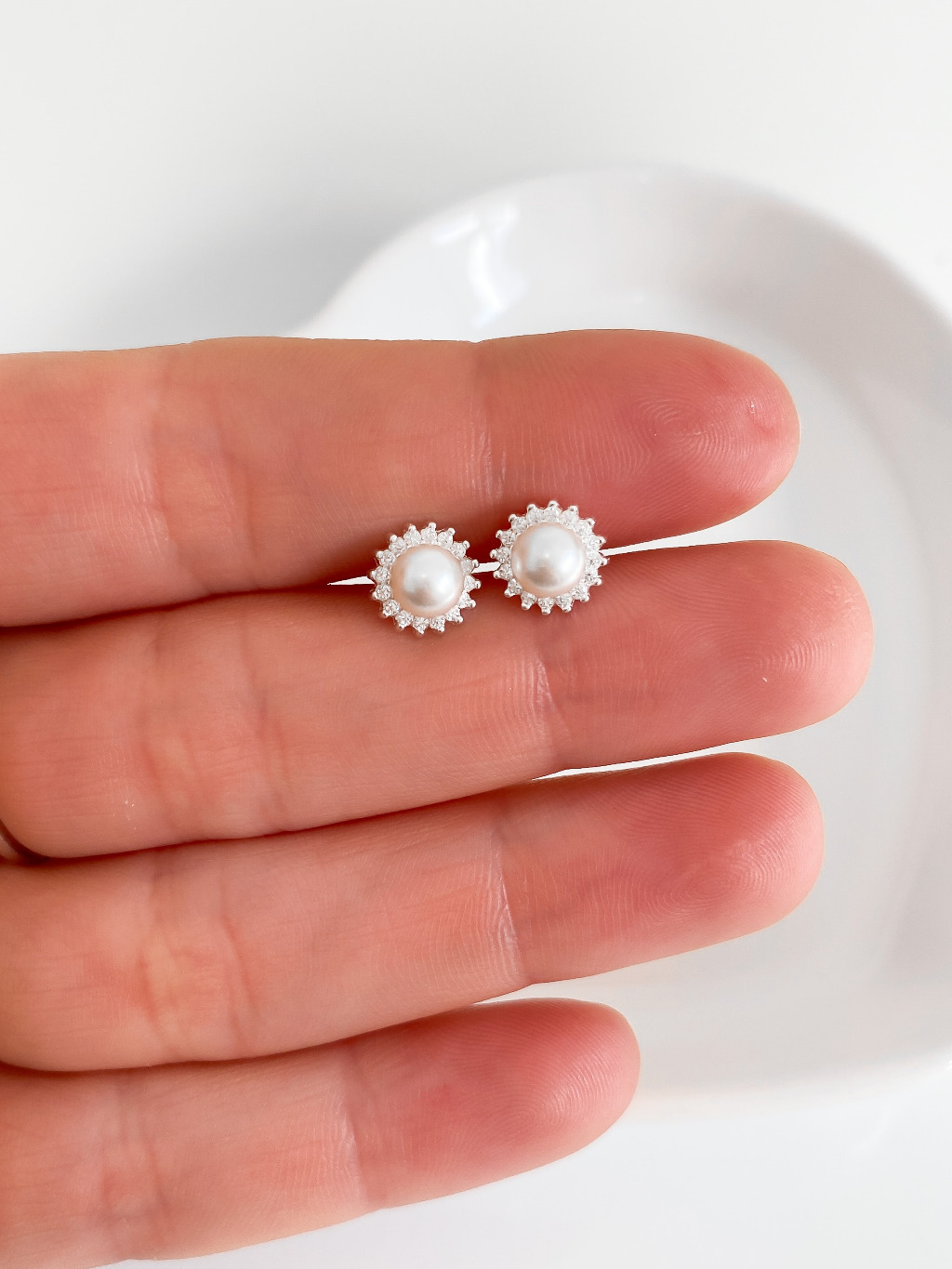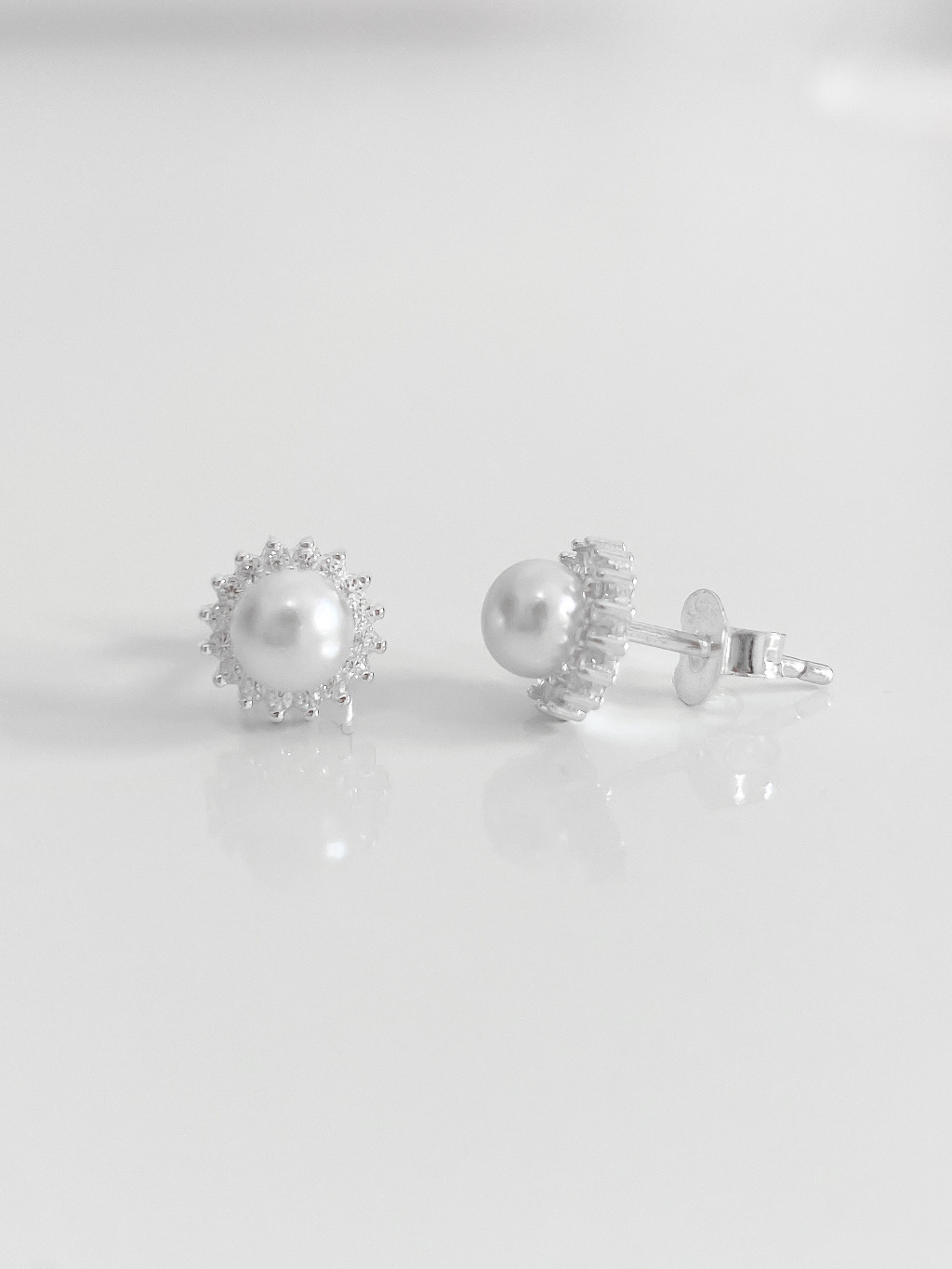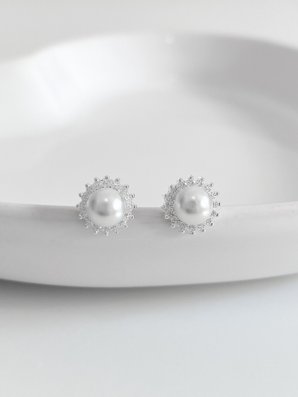 Brinco pequeno feminino em prata 925 legítima pérola shell cravejado ao redor