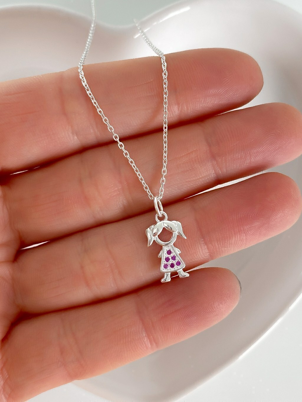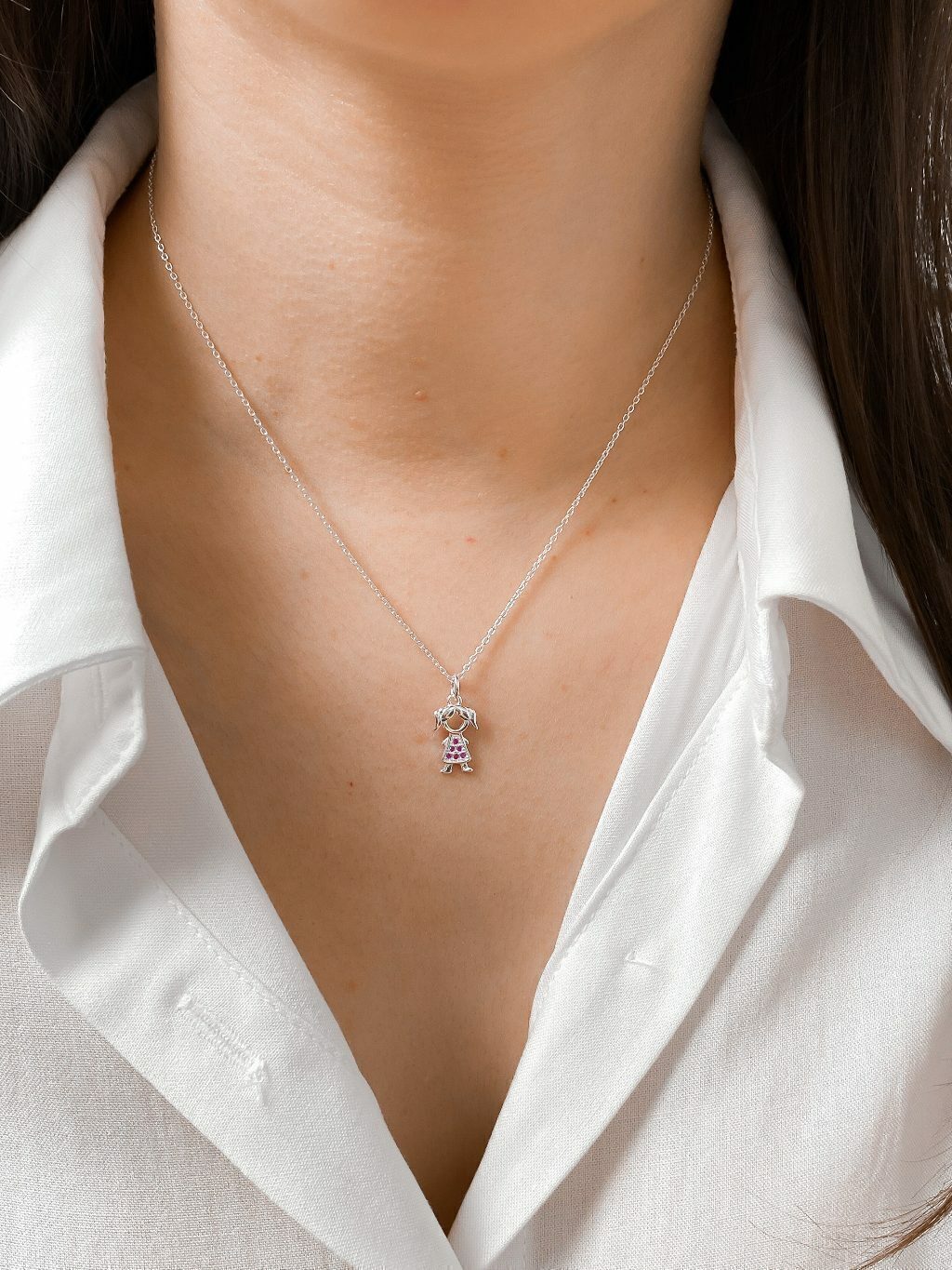 Colar em prata 925 legítima com pingente pequeno de filha menina cravejado com zircônias rosas.