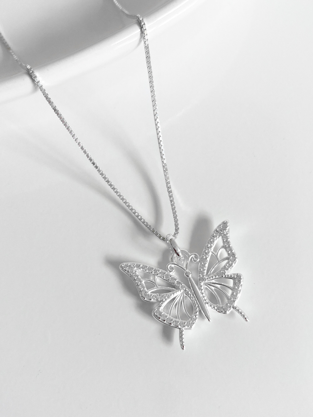 Colar Feminino em Prata 925 Legítima com Pingente de borboleta Cravejado com Zircônias