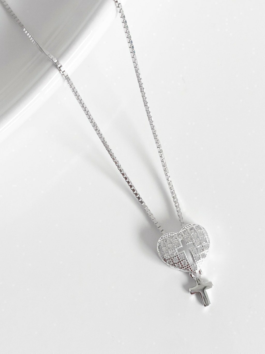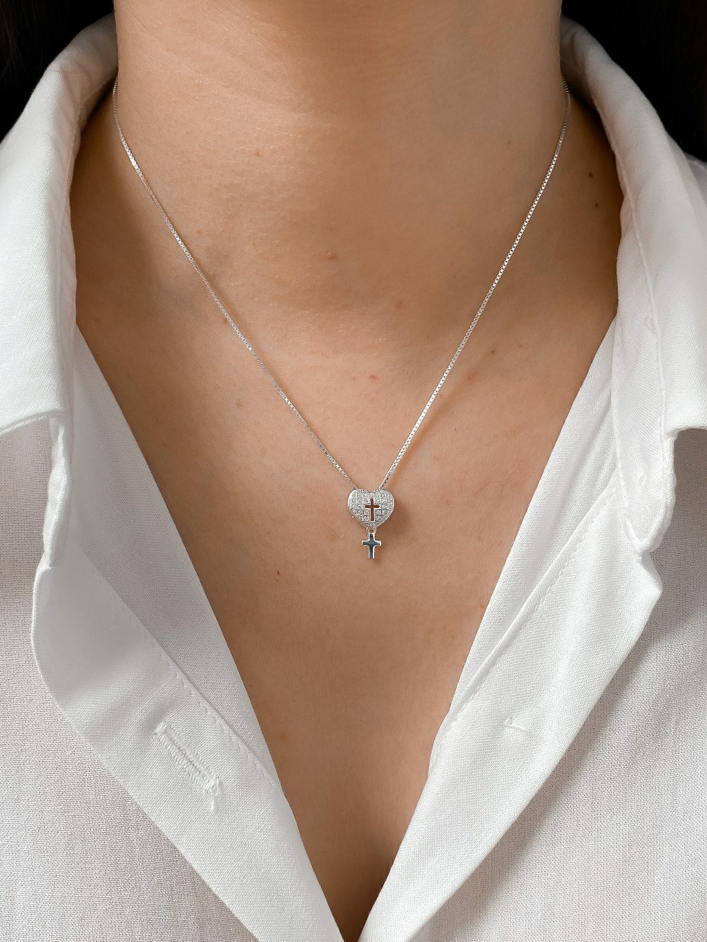 Colar feminino em Prata 925 legítima com pingente de coração com cruz vazada cravejado com zircônias e cruz pendurada.