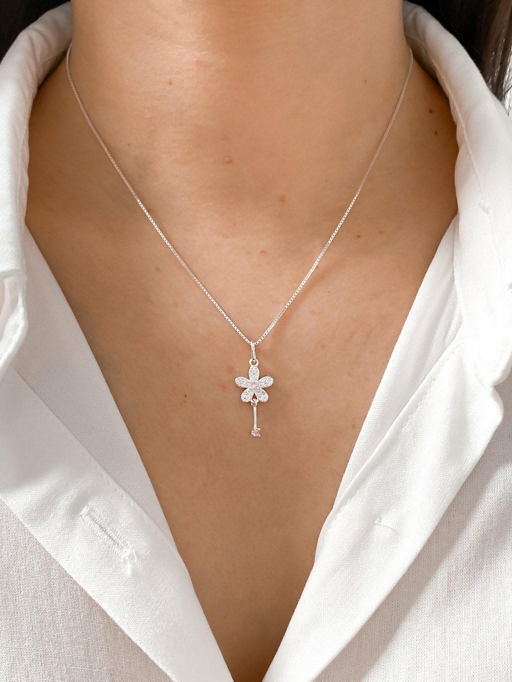 Colar feminino em prata 925 legítima com pingente de flor cravejada com zircônias.