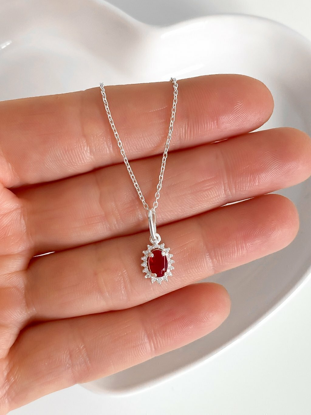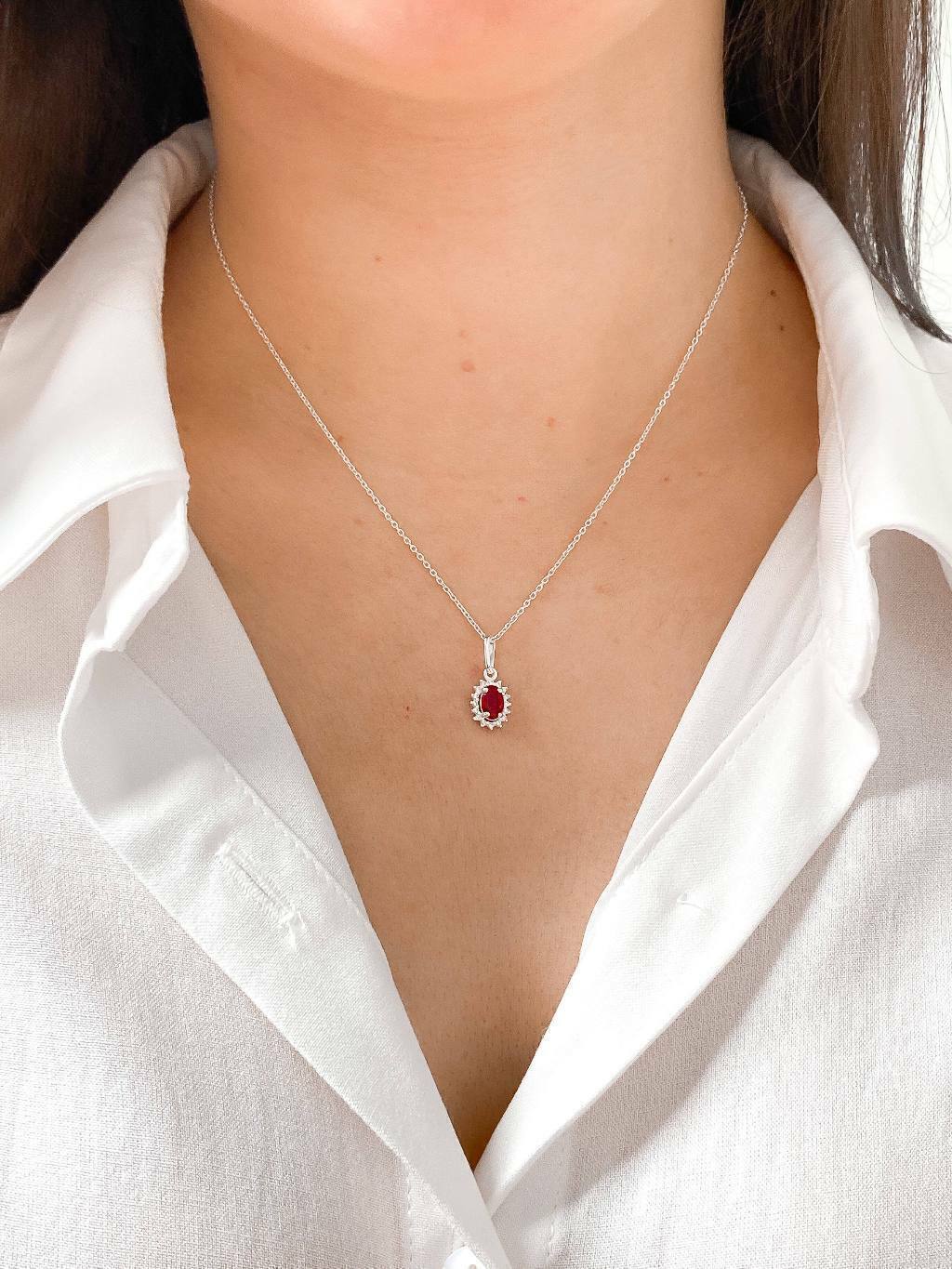 Colar feminino em prata 925 legítima com pingente de zircônia oval vermelho rubi cravejado com zircônias ao redor.