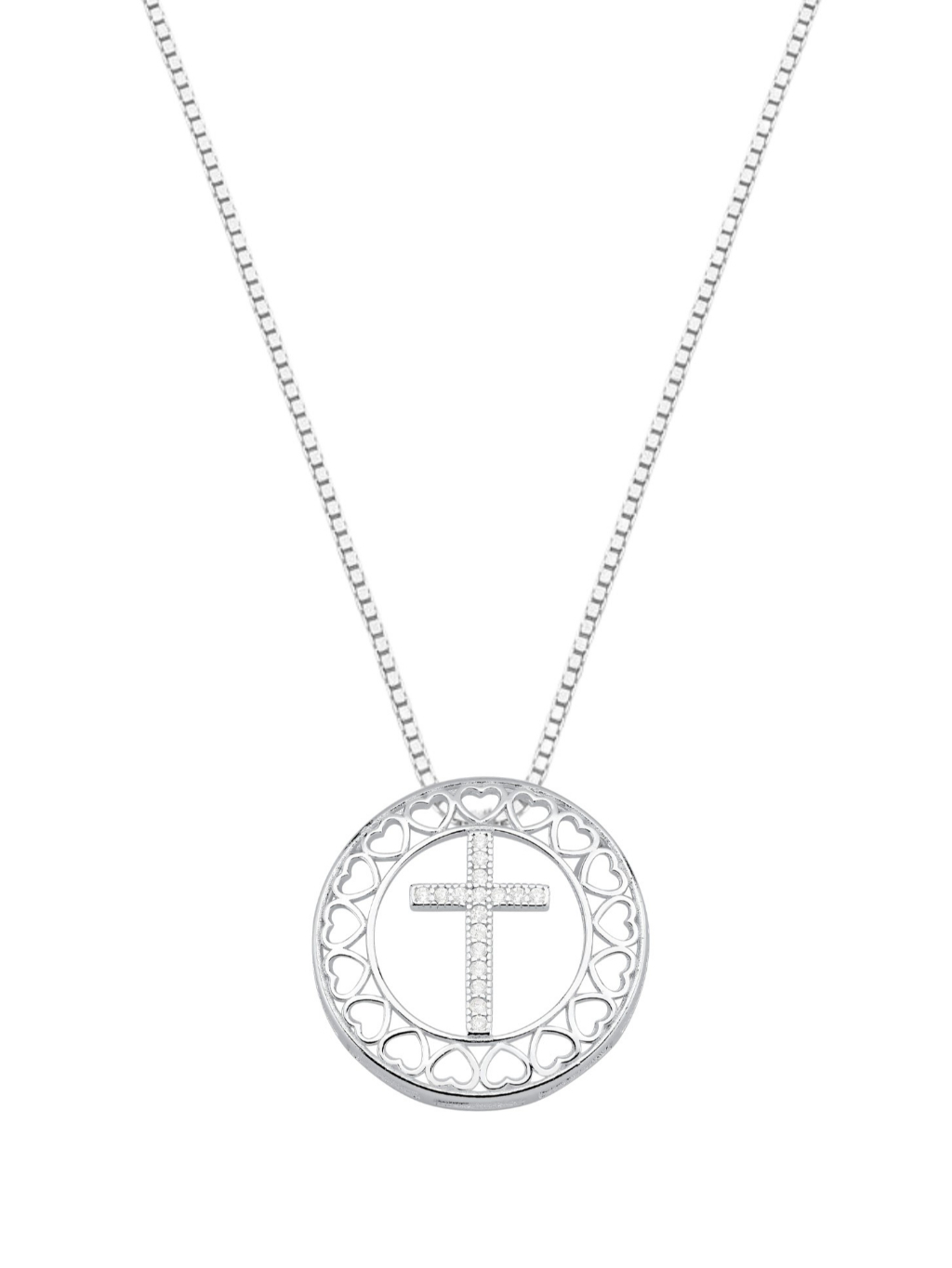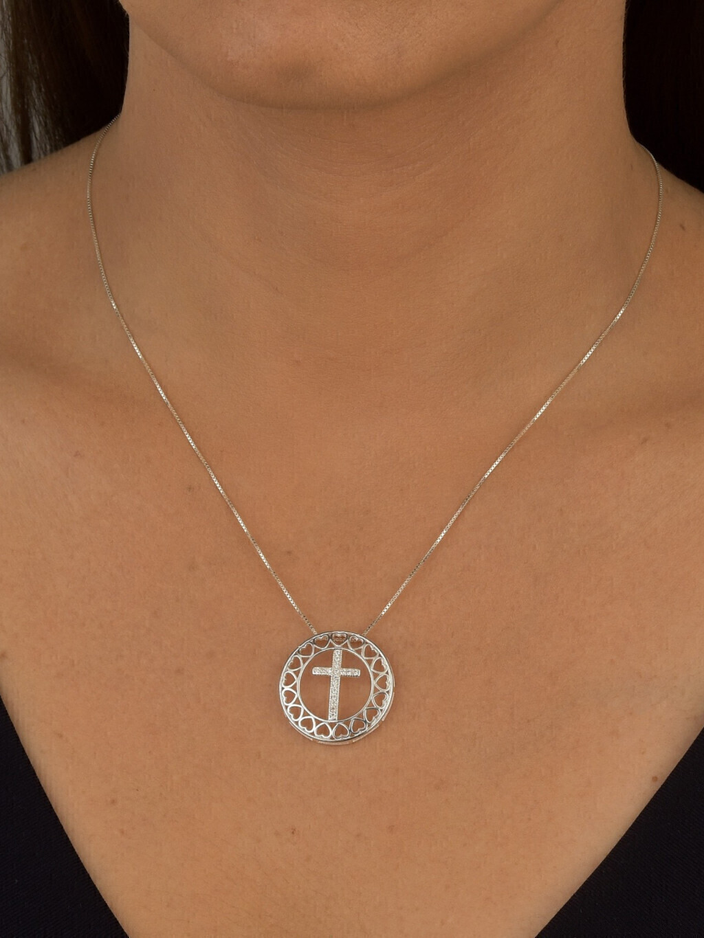 Colar feminino em Prata 925 legítima com pingente redondo com cruz no meio cravejado com zircônias e corações vazados