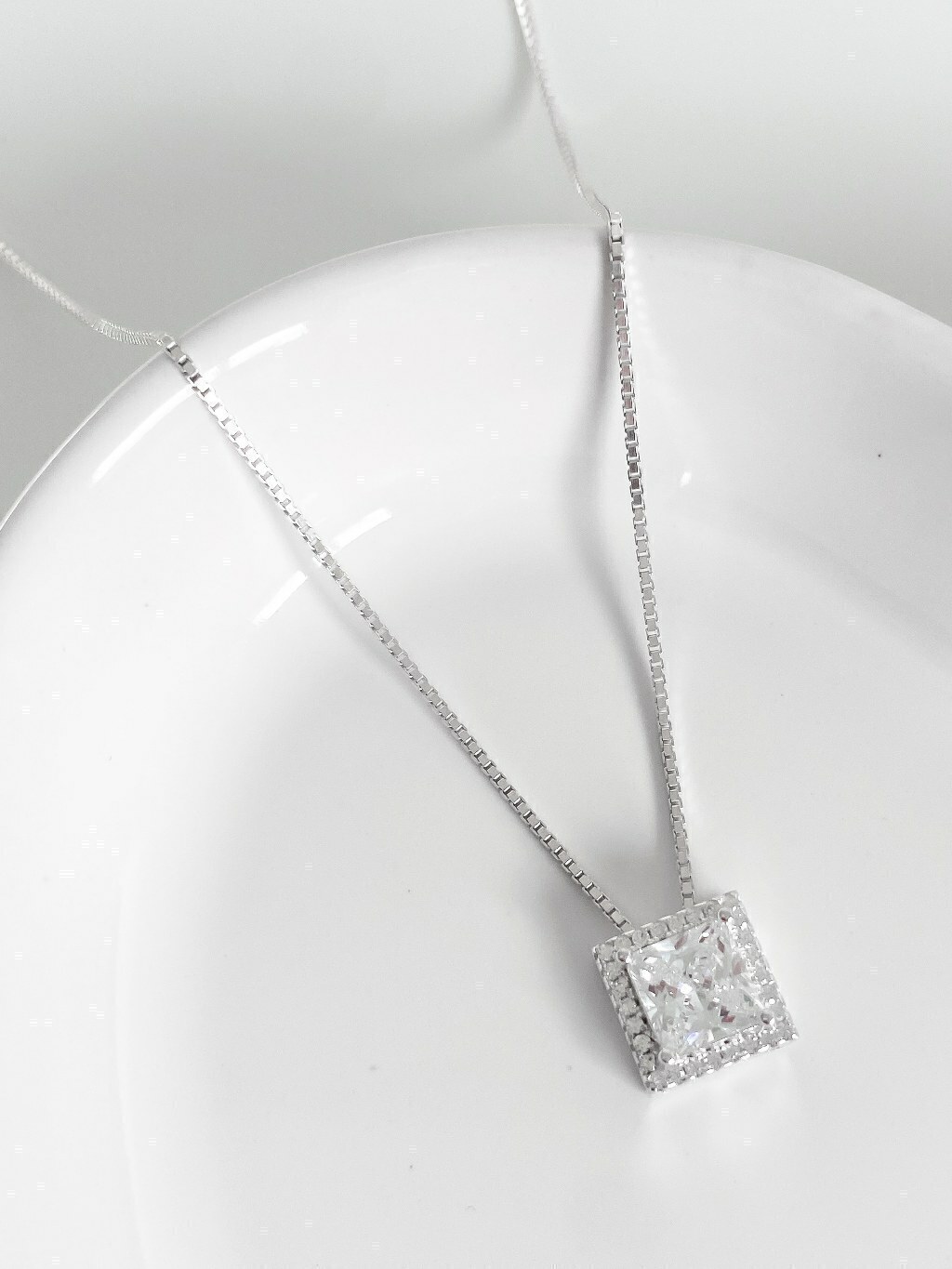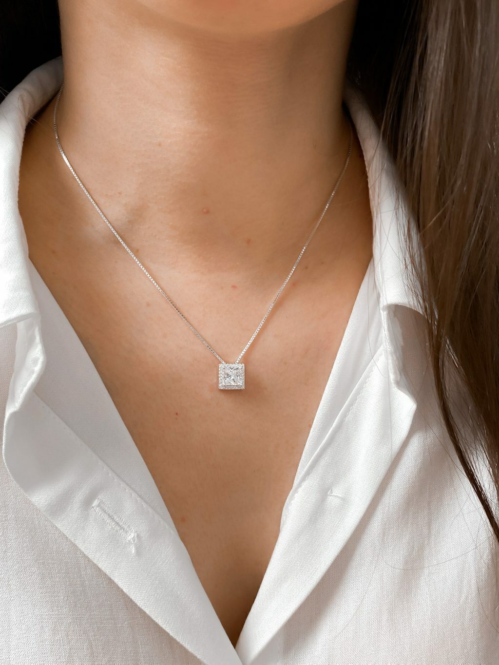 Colar feminino em Prata 925 legítima Zircônia quadrada cravejada com Zircônias ao redor.