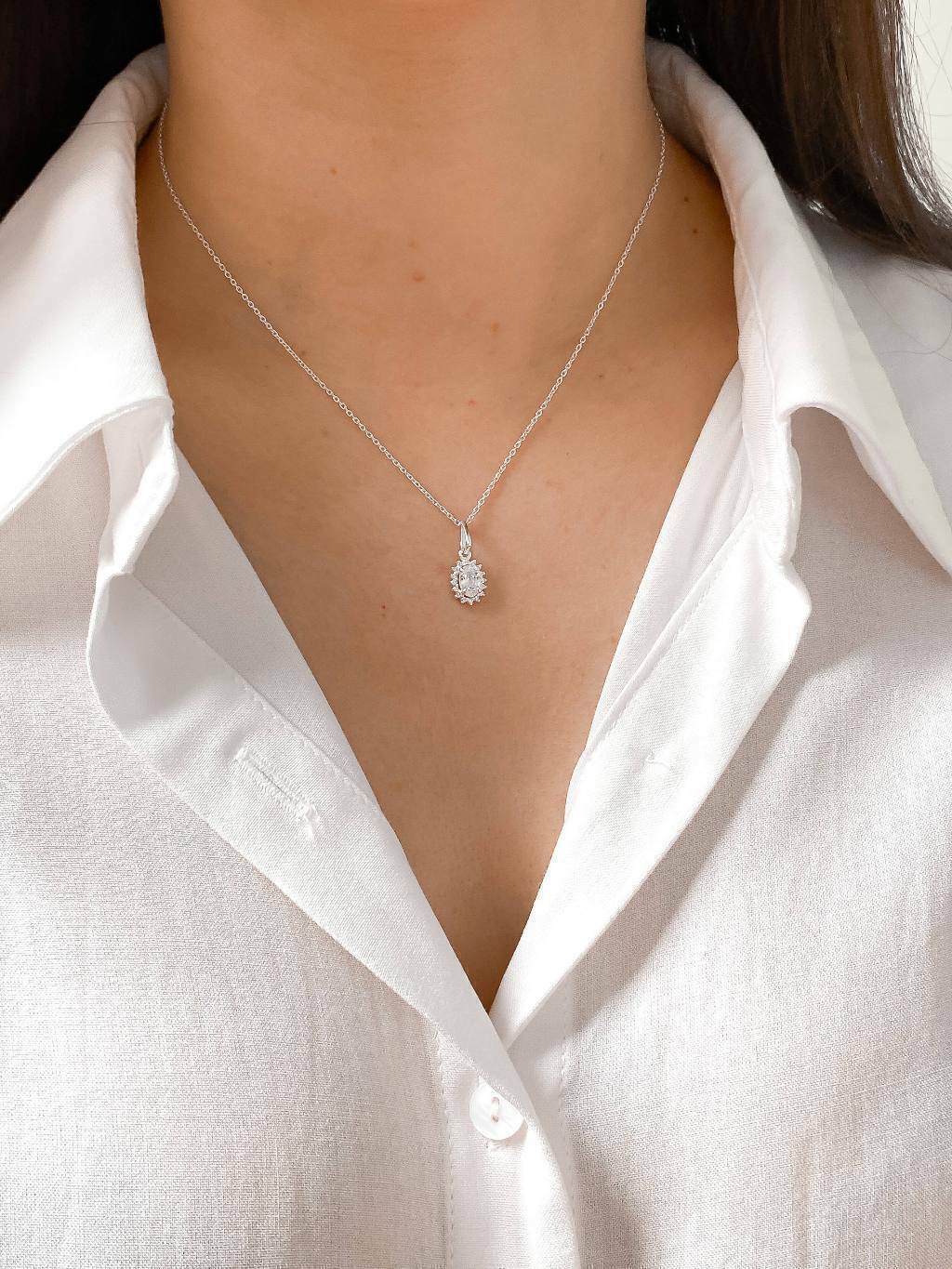 Conjunto Brinco e Colar em Prata 925 legítima Zircônia oval cravejada com Zircônias ao redor.