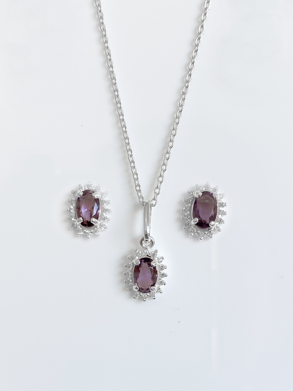 Conjunto Brinco e Colar em Prata 925 legítima Zircônia oval lilás ametista cravejada com Zircônias ao redor.