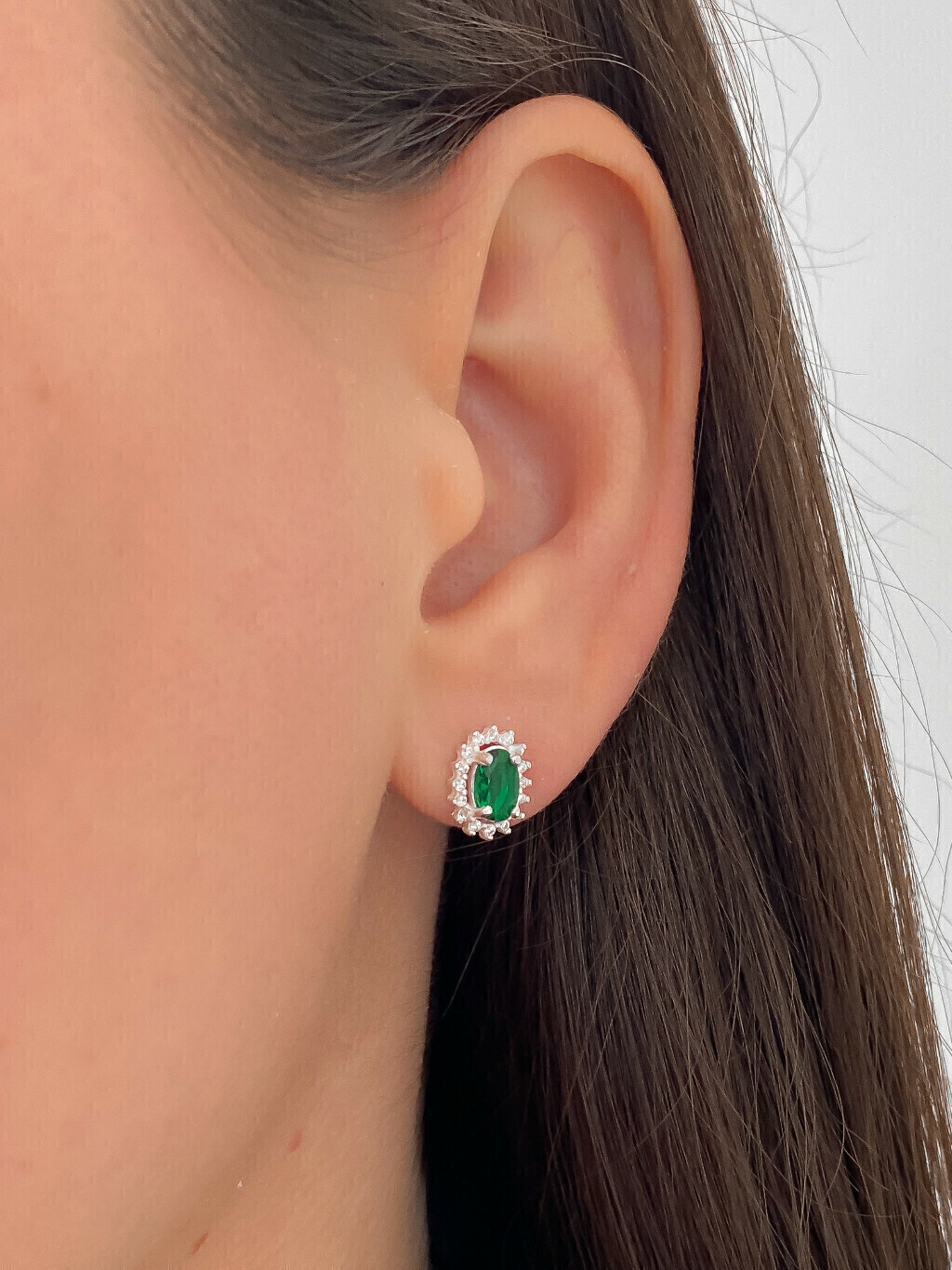 Conjunto Brinco e Colar em Prata 925 legítima Zircônia oval verde esmeralda cravejada com Zircônias ao redor.