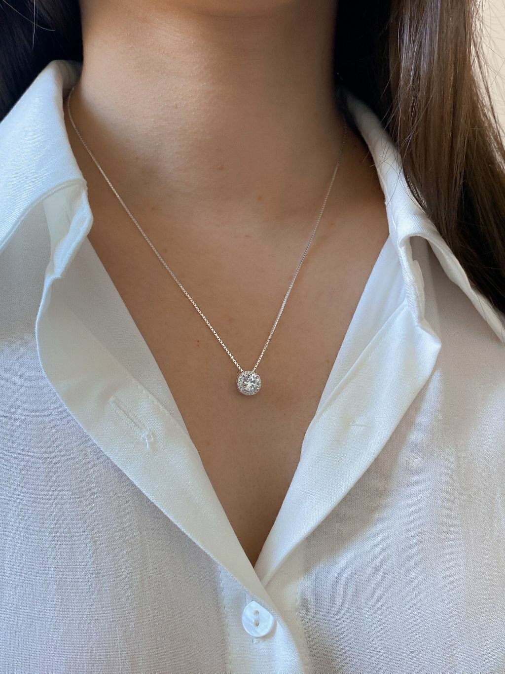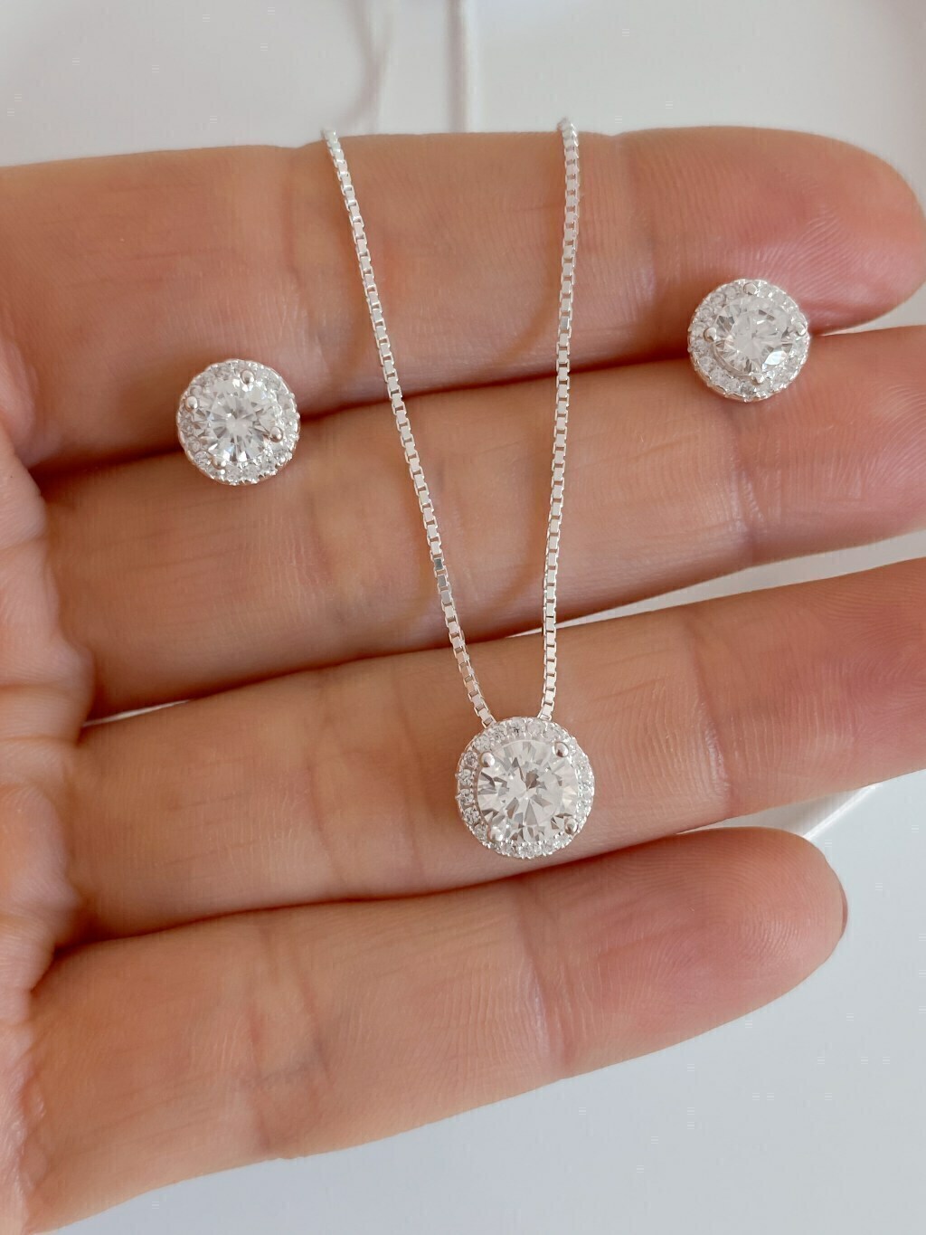 Conjunto Brinco e Colar em Prata 925 legítima Zircônia redonda cravejada com Zircônias ao redor veneziana V15.
