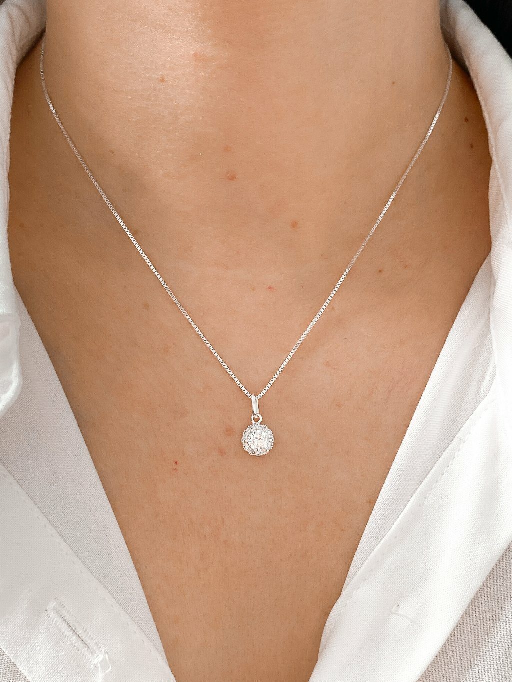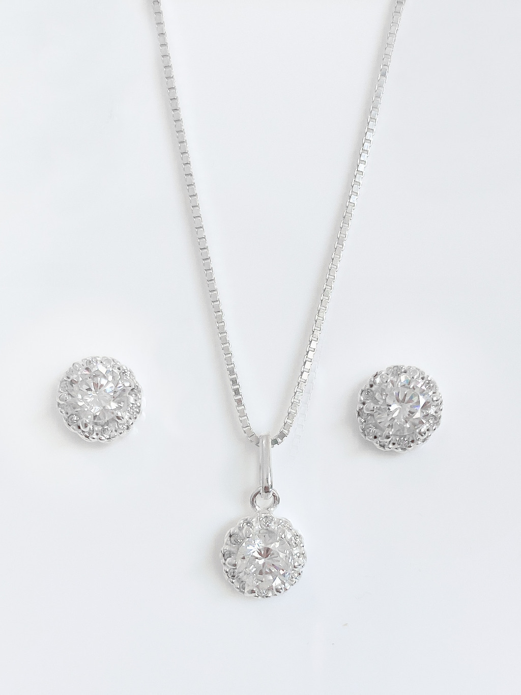 Conjunto Brinco e Colar ponto de luz em Prata 925 legítima Zircônia redonda cravejada com Zircônias ao redor.
